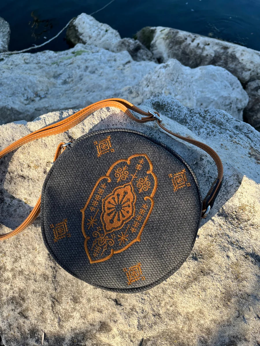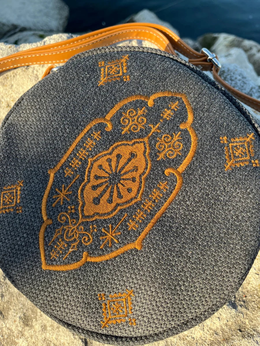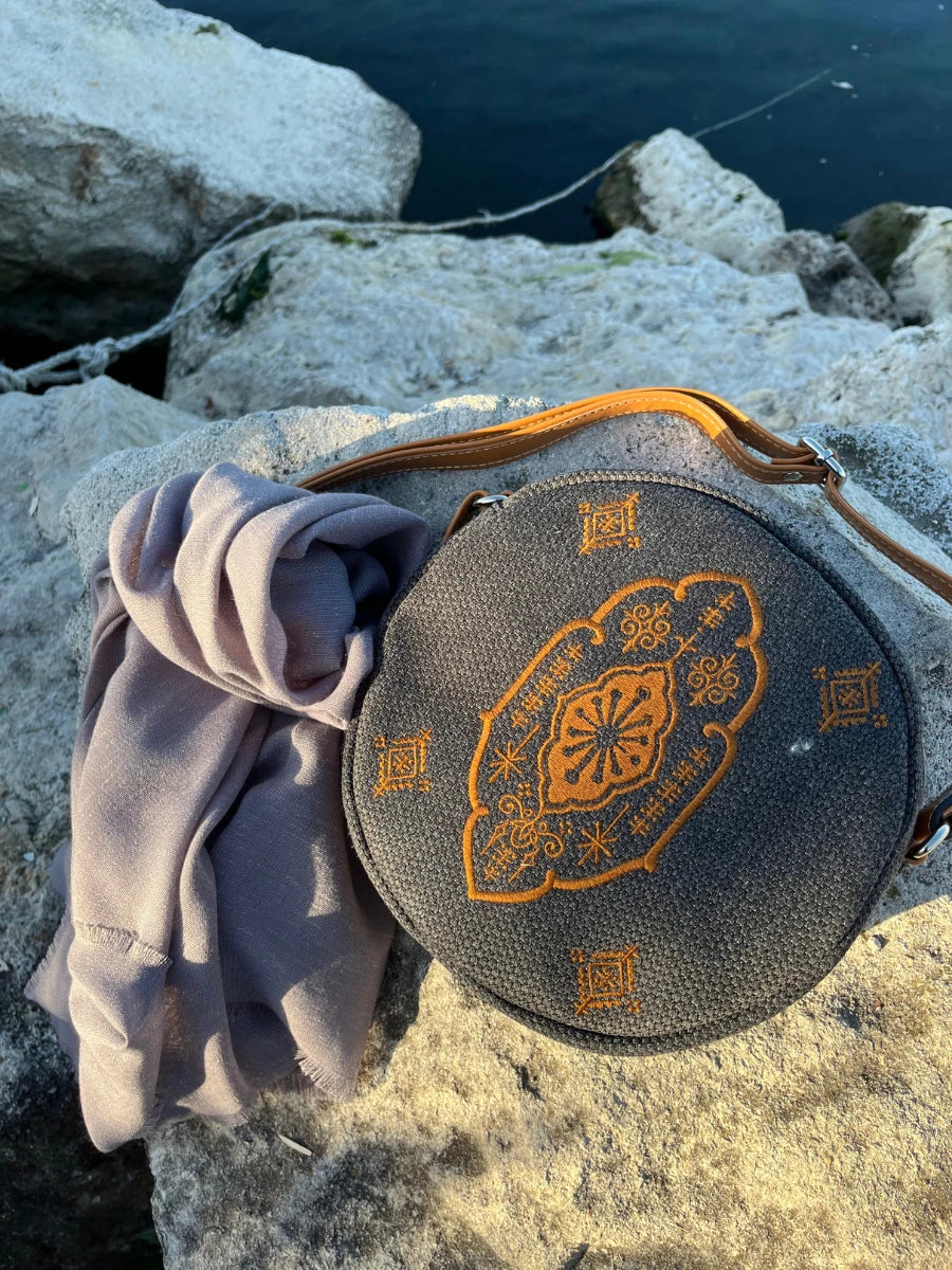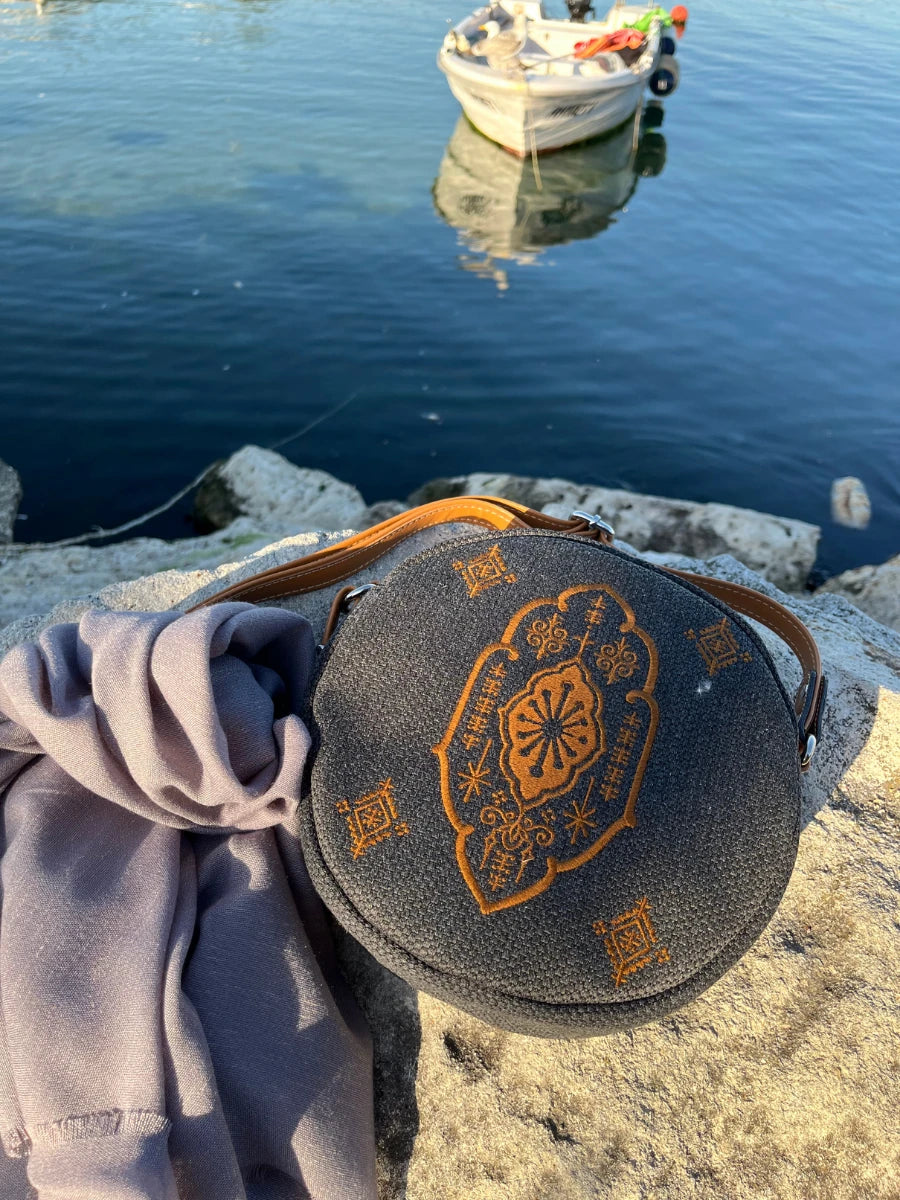 Anadolu Nakışlı Yuvarlak Koyu Antrasit Çanta