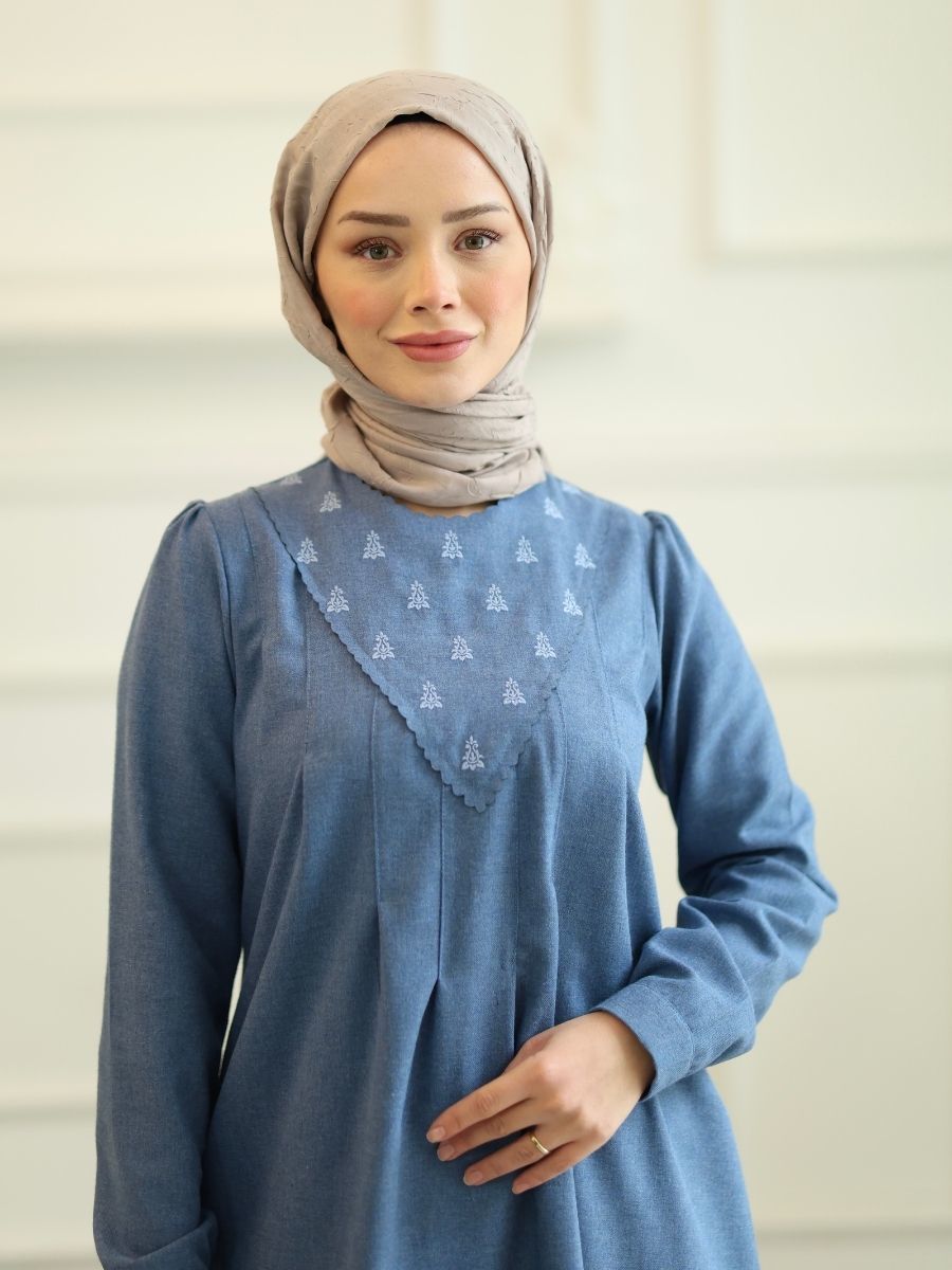 Barok Tunik Mavi, pamuklu flanel kumaşın sıcak dokusunu mavi rengin ferahlatıcı etkisiyle birleştiren modern bir tuniktir. Ürün, kışlık kumaş yapısı sayesinde hem sıcak tutar hem de şıklığıyla öne çıkar. Mavi rengin canlılığı, tunik üzerinde sofistike detaylarla tamamlanarak her ortamda dikkat çeker.