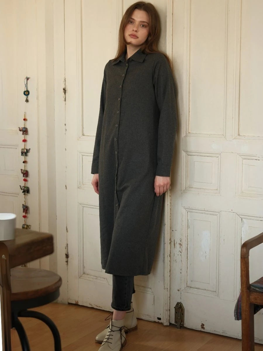 Basic Flanel Tunik Koyu Antrasit + Pamuklu Desenli Eşarp, koyu antrasit rengin modern şıklığını %100 pamuklu flanel kumaşın sıcaklığıyla buluşturur. Eşarp üzerindeki pamuklu desenler, ürüne özgün bir estetik katar. Bu tunik, soğuk havalarda hem şıklık hem konfor arayanlar için ideal bir tercih sunar.