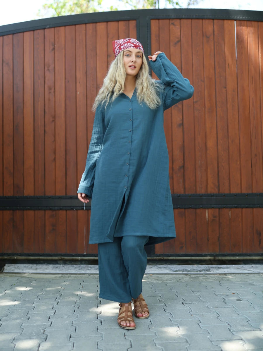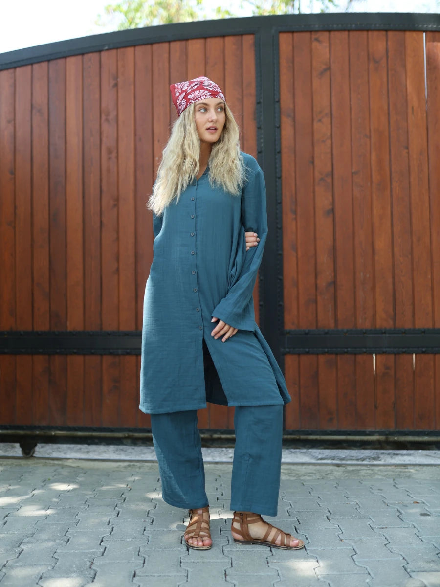%100 pamuk müslin kumaştan üretilen bu petrol renkli Best takım, zarafet ve konforu bir arada sunar. Çift kat dokuma yapısı sayesinde sıcak havalarda ferahlık sağlarken, modern kesimi ve sade detaylarıyla hem günlük hem özel kombinler için ideal bir tercihtir. Petrol rengin enerjik ve ferahlatıcı etkisi, takımın modern tasarımı ile birleşerek sofistike bir stil oluşturur.