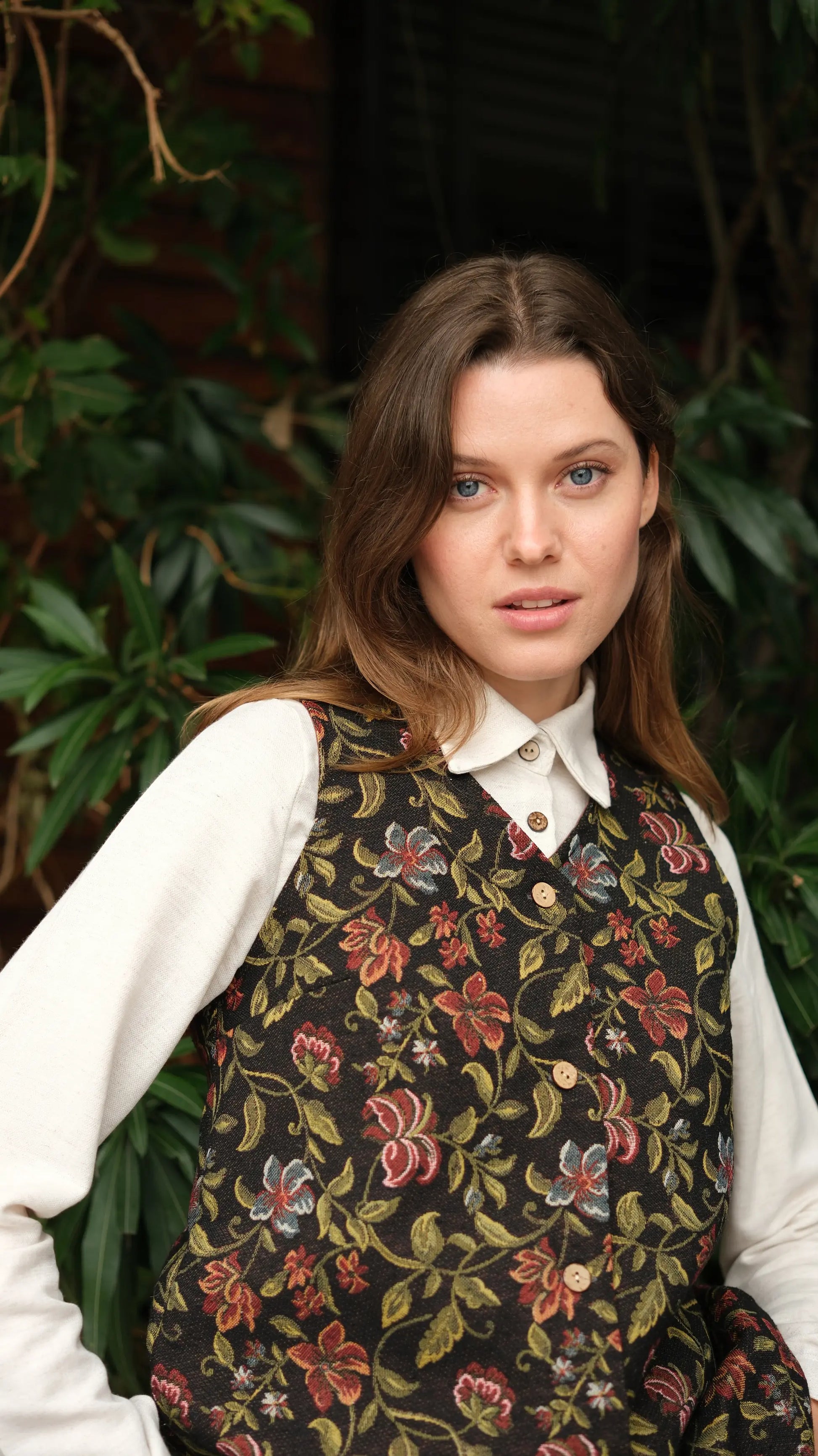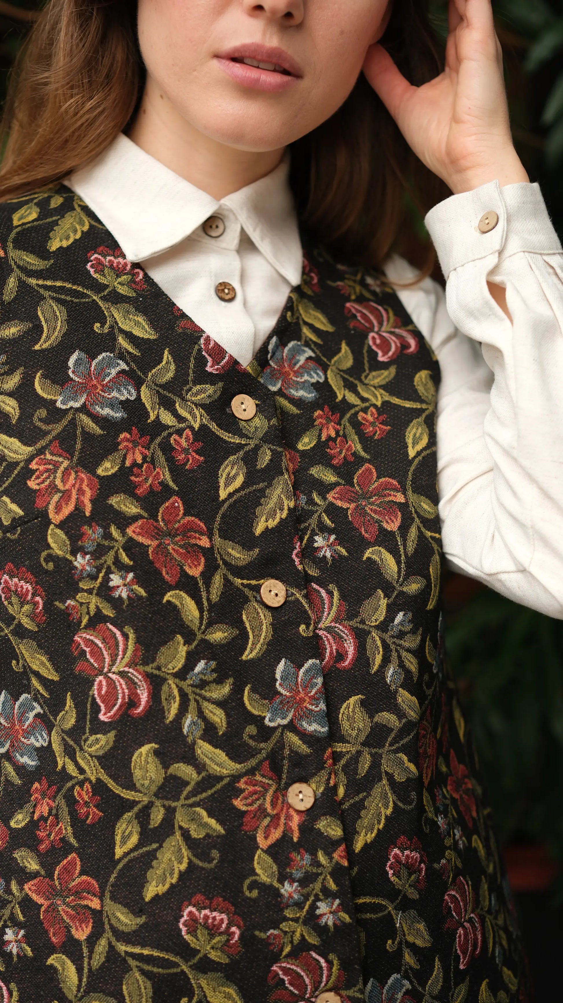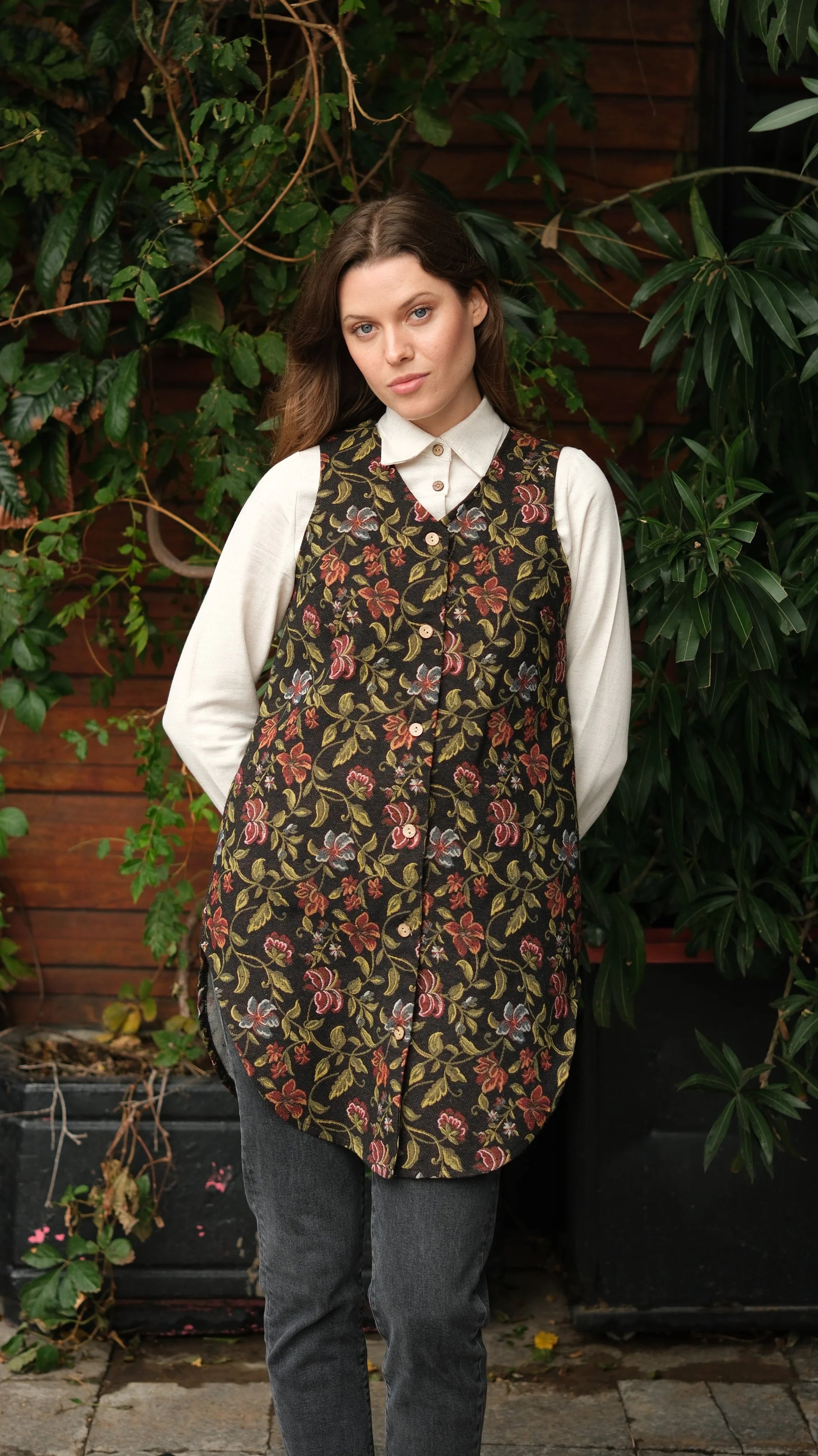 Çiçek Desenli Goblen Uzun Yelek, özel dokuma goblen kumaşın zarif dokusunu çiçek desenleriyle birleştiren sofistike bir aksesuardır. Ürün, hafif yapısı ve özenle işlenmiş detayları ile günlük kullanımda konfor ve şıklığı garanti eder. Klasik ve modern stilleri bir araya getiren bu yelek, kombinlerinize zarif bir dokunuş katar.