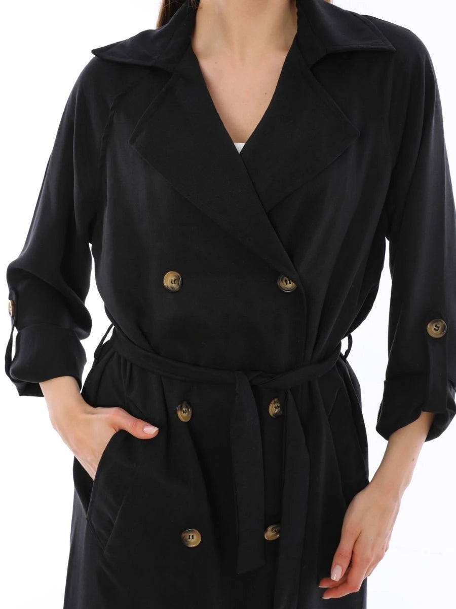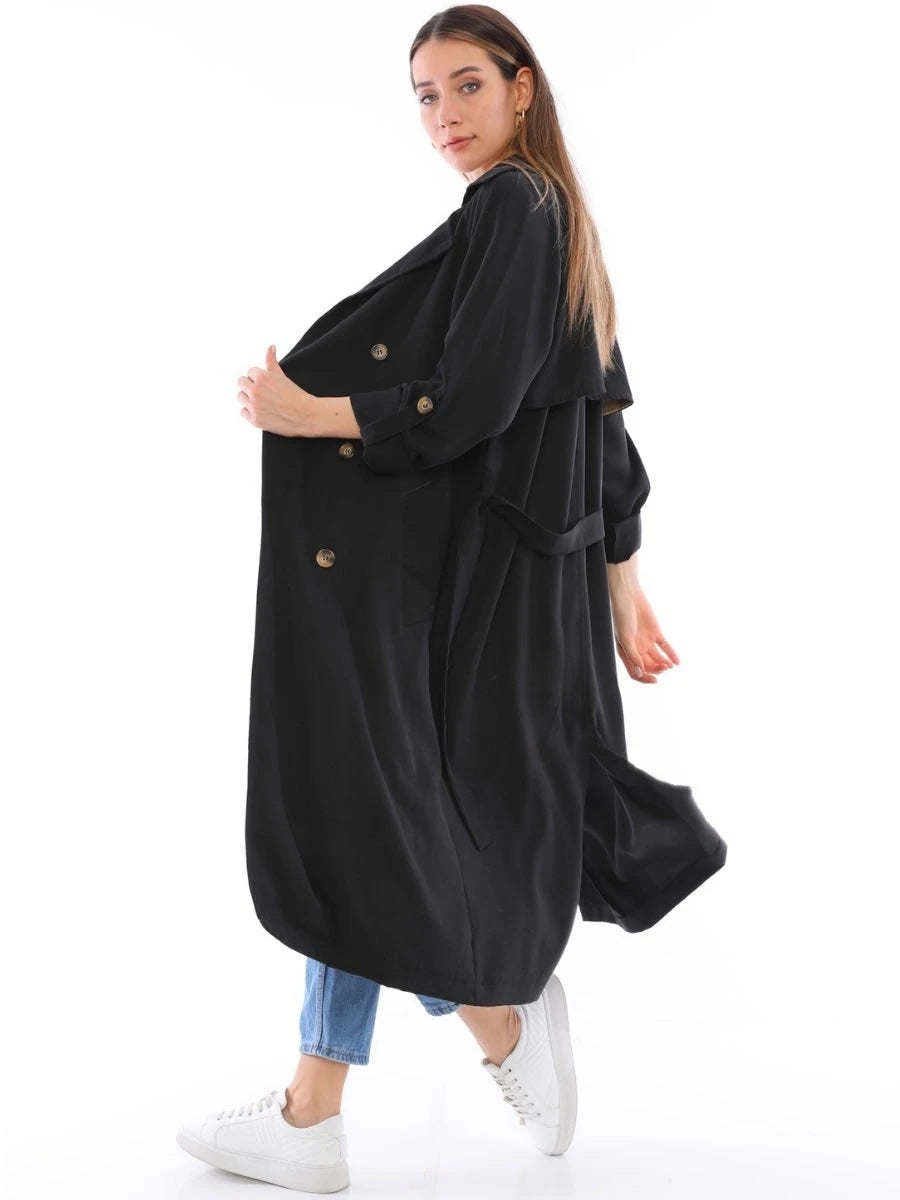 Cool Trençkot Siyah, pamuklu viskon tensel kumaşın üstün konforunu siyahın zamansız şıklığı ile birleştiren modern bir dış giyim ürünüdür. Astarsız üretilen bu trençkot, sade tasarımı ve rahat kesimi ile her ortamda şıklığınızı tamamlar. Ürün, üstün konfor ve estetik sunarak stilinize değer katar.