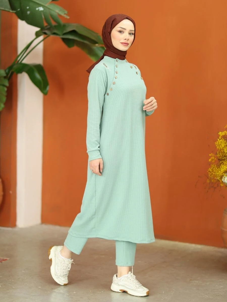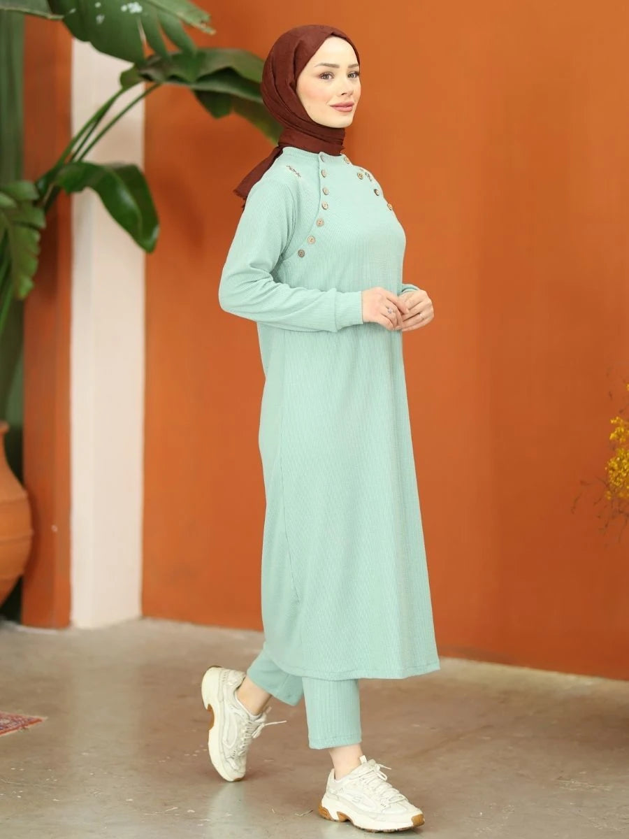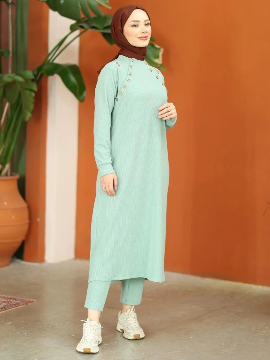 Düğmeli Triko Takım Nefti Yeşil