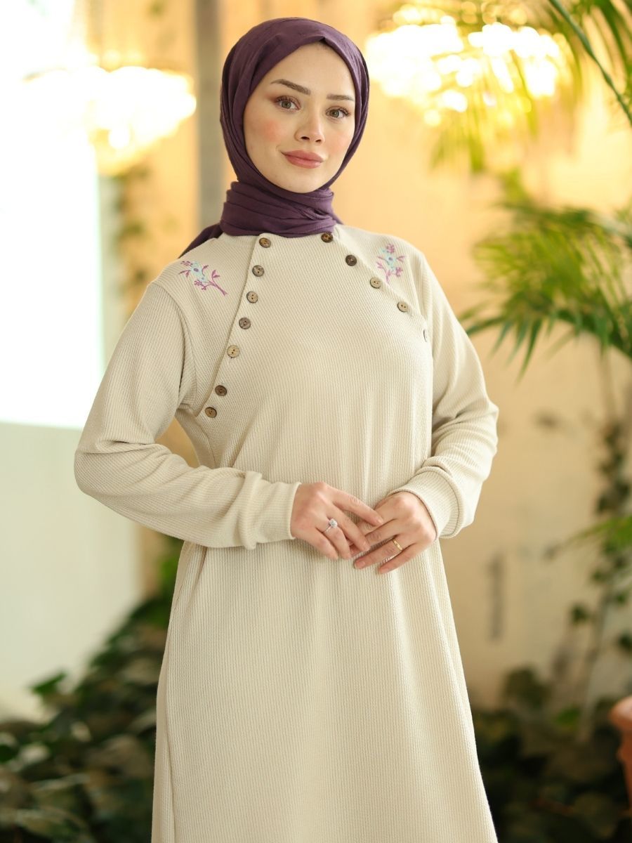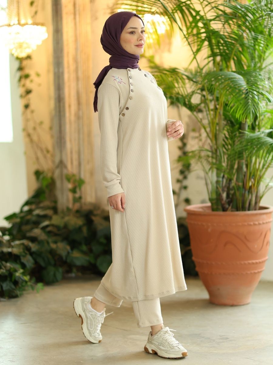 Düğmeli Triko Takım Taş, pamuklu triko örgü kumaşın klasik dokusunu taş renginin modern estetiği ile birleştiren şık bir takımdır. Düğmeli detayları sayesinde hem fonksiyonel hem de stil sahibi olan bu ürün, kış sezonu için idealdir. Hem tunik hem de pantolon, özenle kesilmiş olup günlük kullanımda üstün konfor sağlar.
