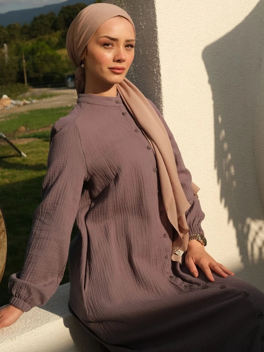 Elegan Elbise Koyu Gri, %100 pamuk müslin kumaşın zarif dokusunu koyu gri rengin modern ve minimal etkisiyle sunan şık bir elbisedir. Çift kat dokuma yapısı ile üstün konfor ve şıklığı bir arada sunar. Modern kesimi ve zarif detayları, her ortamda stilinizi tamamlar ve öne çıkarır.