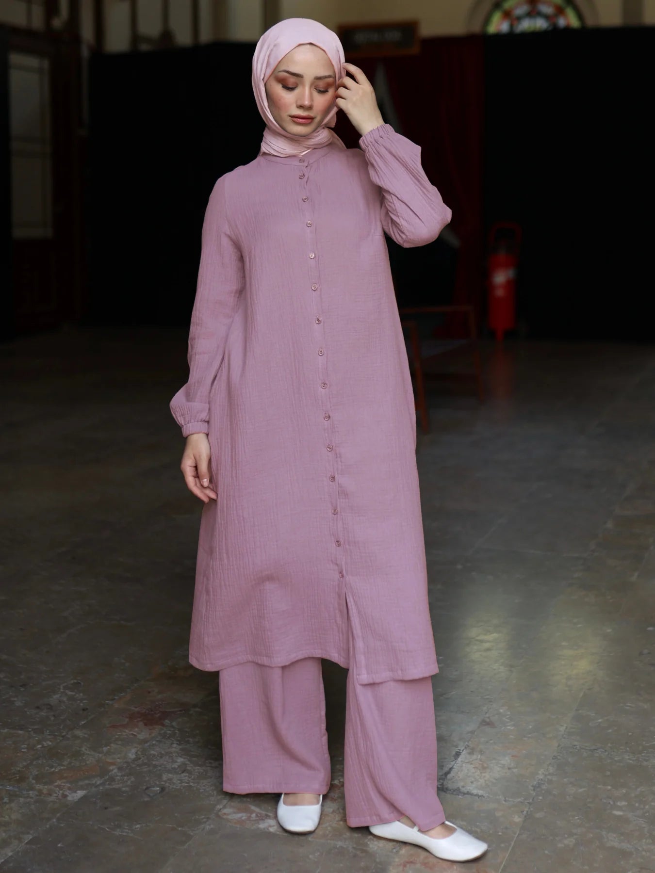 %100 pamuk müslin kumaştan üretilen bu gül kurusu renkli Elegan takım, zarafet ve konforu bir arada sunar. Çift kat dokuma yapısı sayesinde sıcak havalarda ferahlık sağlarken, modern kesimi ve sade detaylarıyla hem günlük hem özel kombinler için ideal bir tercihtir. Gül kurusu rengin enerjik ve ferahlatıcı etkisi, takımın modern tasarımı ile birleşerek sofistike bir stil oluşturur.