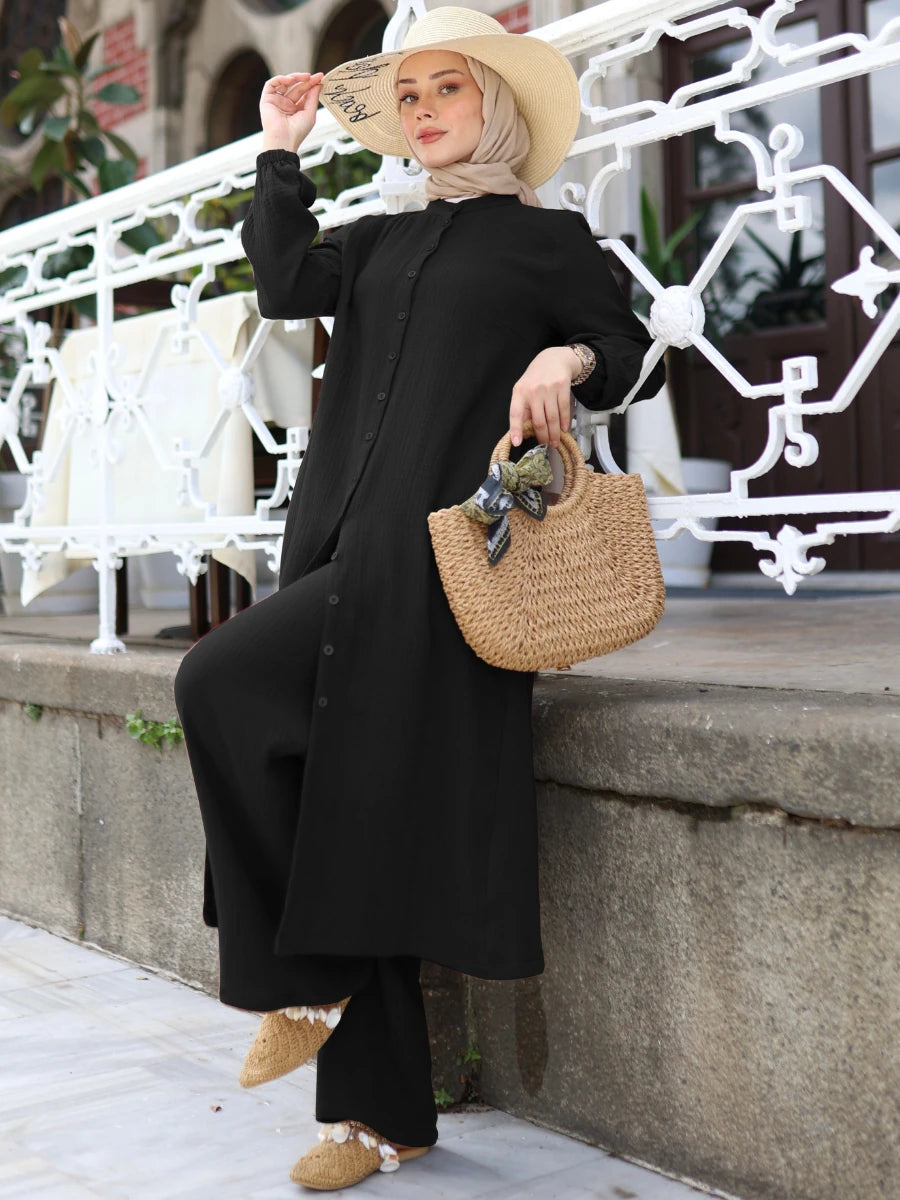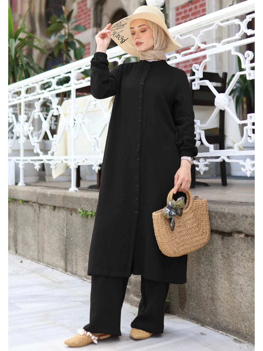 %100 pamuklu müslin kumaştan üretilen bu siyah renkli ikili takım, çift kat dokuma yapısı sayesinde yaz ve mevsimlik kullanıma uygundur. Hafif ve nefes alabilir dokusuyla sıcak havalarda konfor sağlar. Modern kesimiyle hem tunik hem pantolon, günlük şıklığı zarafetle birleştirir. Siyah rengin klasik ve güçlü etkisiyle her ortama uyum sağlar.