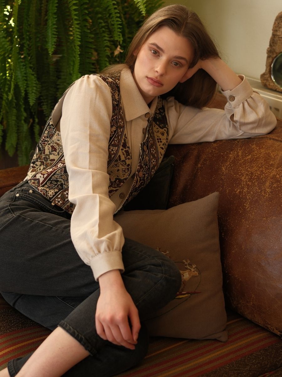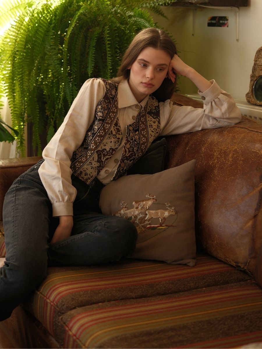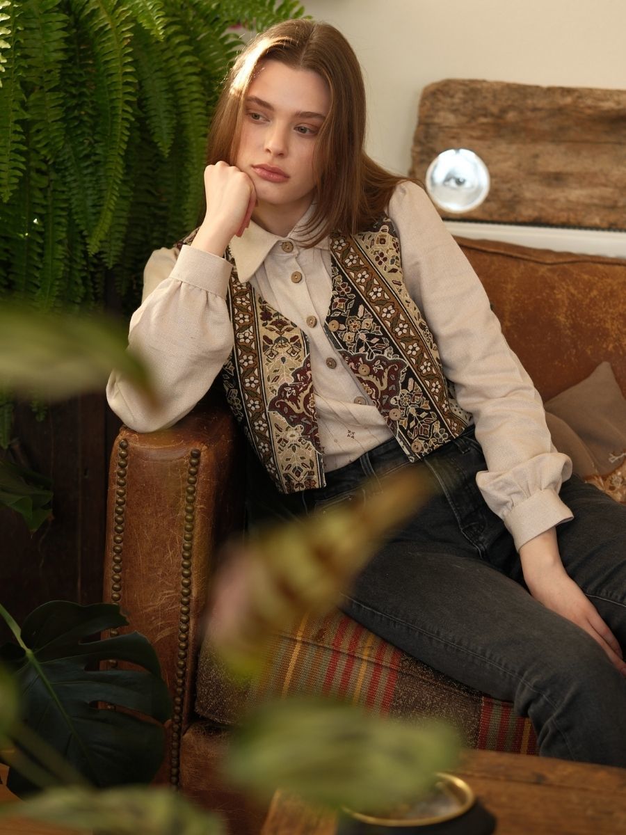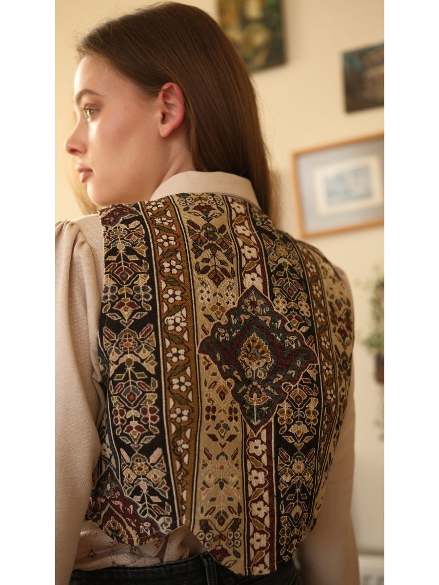 Etnik Desen Goblen Yelek, özgün etnik motiflerle süslenmiş özel dokuma goblen kumaştan üretilmiştir. Klasik kesimi ve modern detaylarıyla, bu yelek her türlü kombinle uyum sağlayacak şıklığı sunar. Rahat ve dayanıklı yapısı, soğuk günlerde ekstra konfor sağlar.