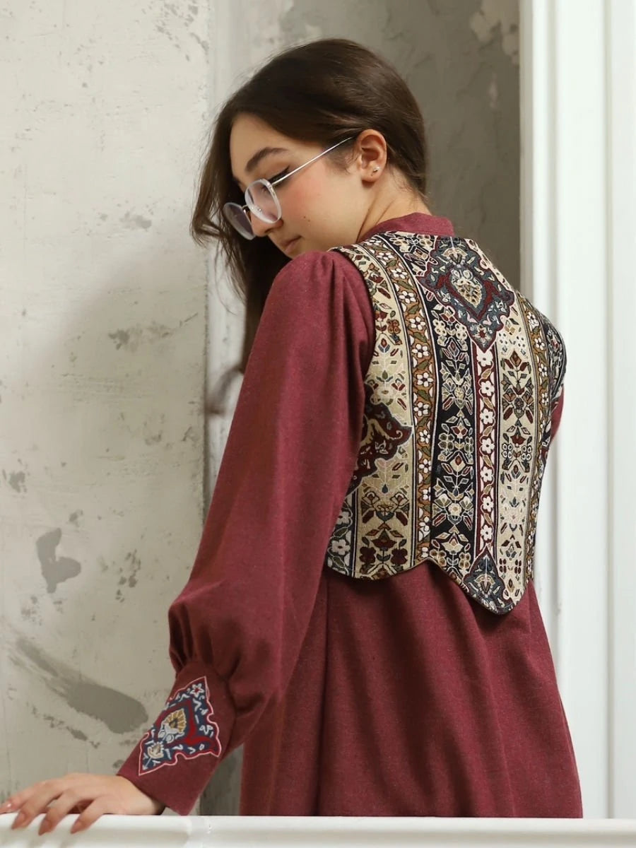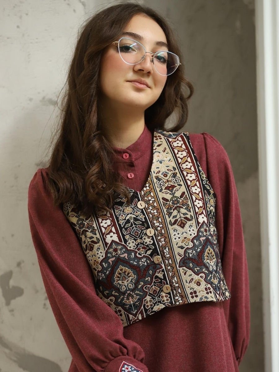 Goblen Yelek, özel dokuma goblen kumaşın zarif dokusunu ve modern kesimini yansıtan şık bir aksesuardır. Ürün, hafif ve rahat yapısı ile günlük kullanımda stilinizi tamamlar. Klasik detayları ve özenle işlenmiş kesimi, her ortamda sofistike bir görünüm sunar.