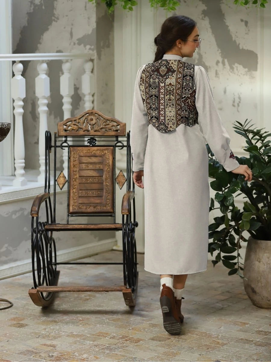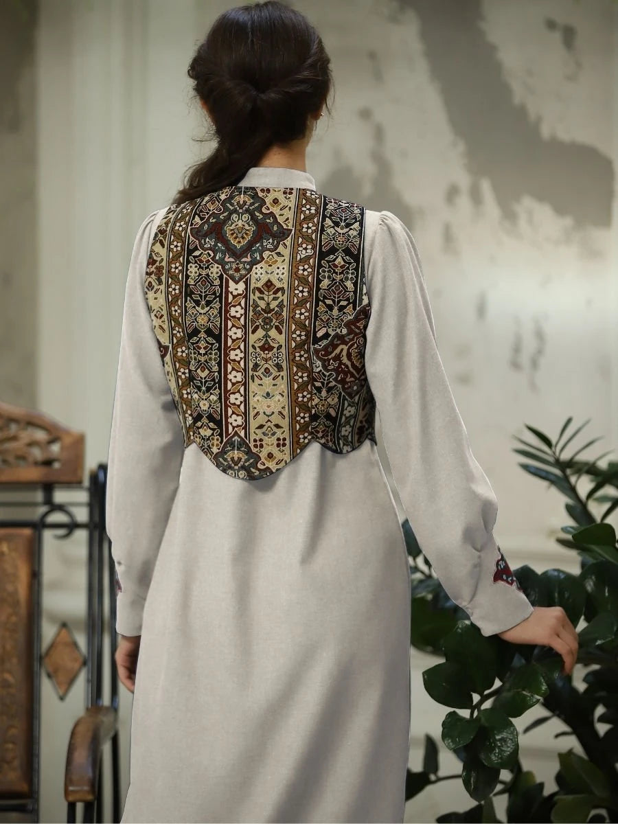 Goblen Yelekli Takım Bej, pamuklu flanel kumaşın sıcak dokusunu, özel dokuma goblen kumaşın zarif bej tonları ile buluşturan şık bir takım kombinidir. Yelek ve tunik, modern tasarımı ve uyumlu renkleri ile hem ofis hem de sosyal ortamlarda stilinizi öne çıkarır. Ürün, konfor ve estetik uyumu ile fark yaratır.