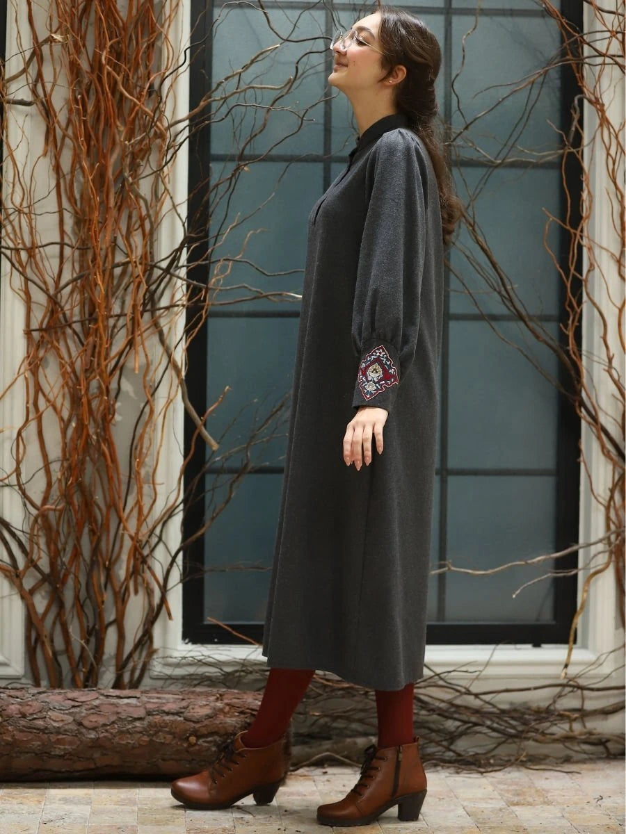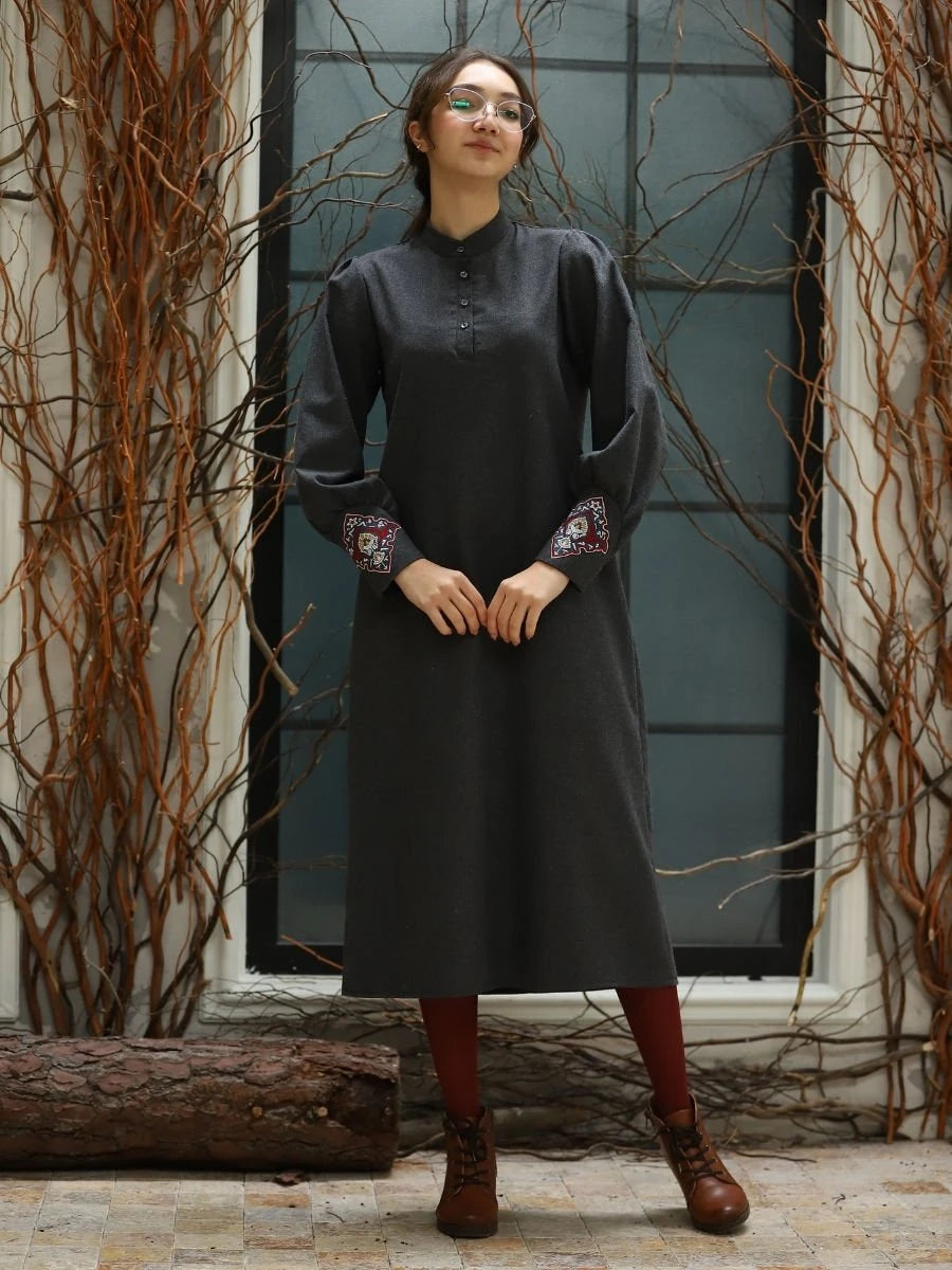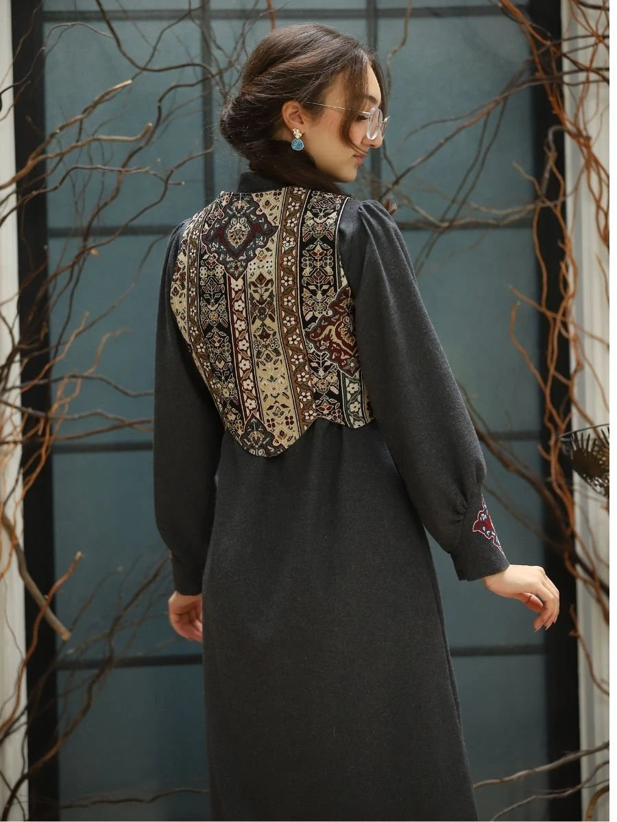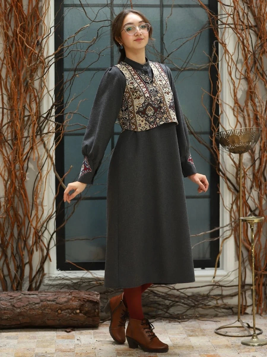 Goblen Yelekli Takım Gri, pamuklu flanel kumaşın sıcak dokusunu, özel dokuma goblen kumaşın modern gri tonları ile birleştiren şık bir kombinasyondur. Yelek ve tunik, özenle tasarlanmış kesimleriyle hem ofis hem de sosyal ortamlarda zarif bir görünüm sunar. Ürün, estetik detayları ile konfor ve şıklık sağlar.