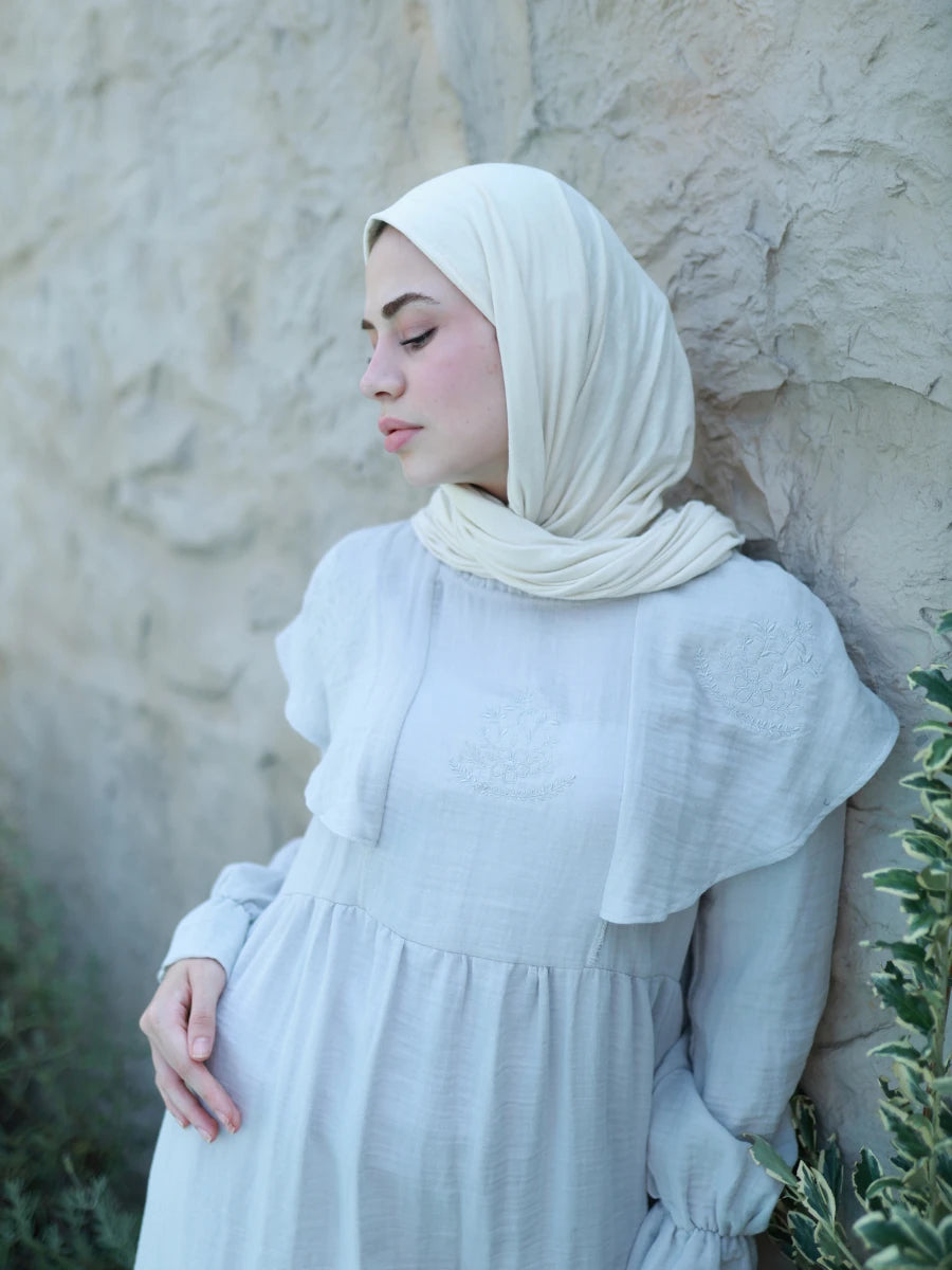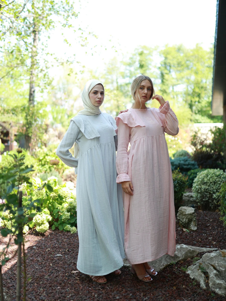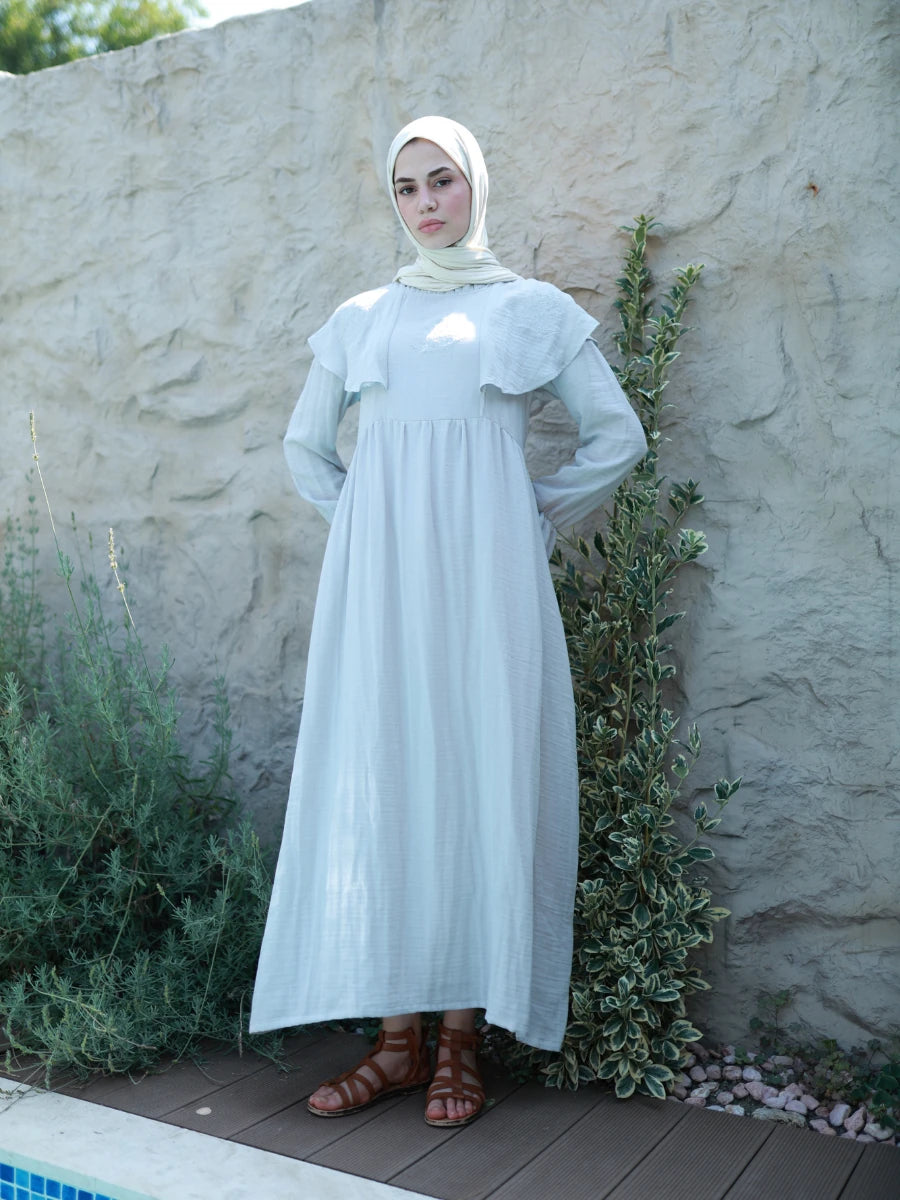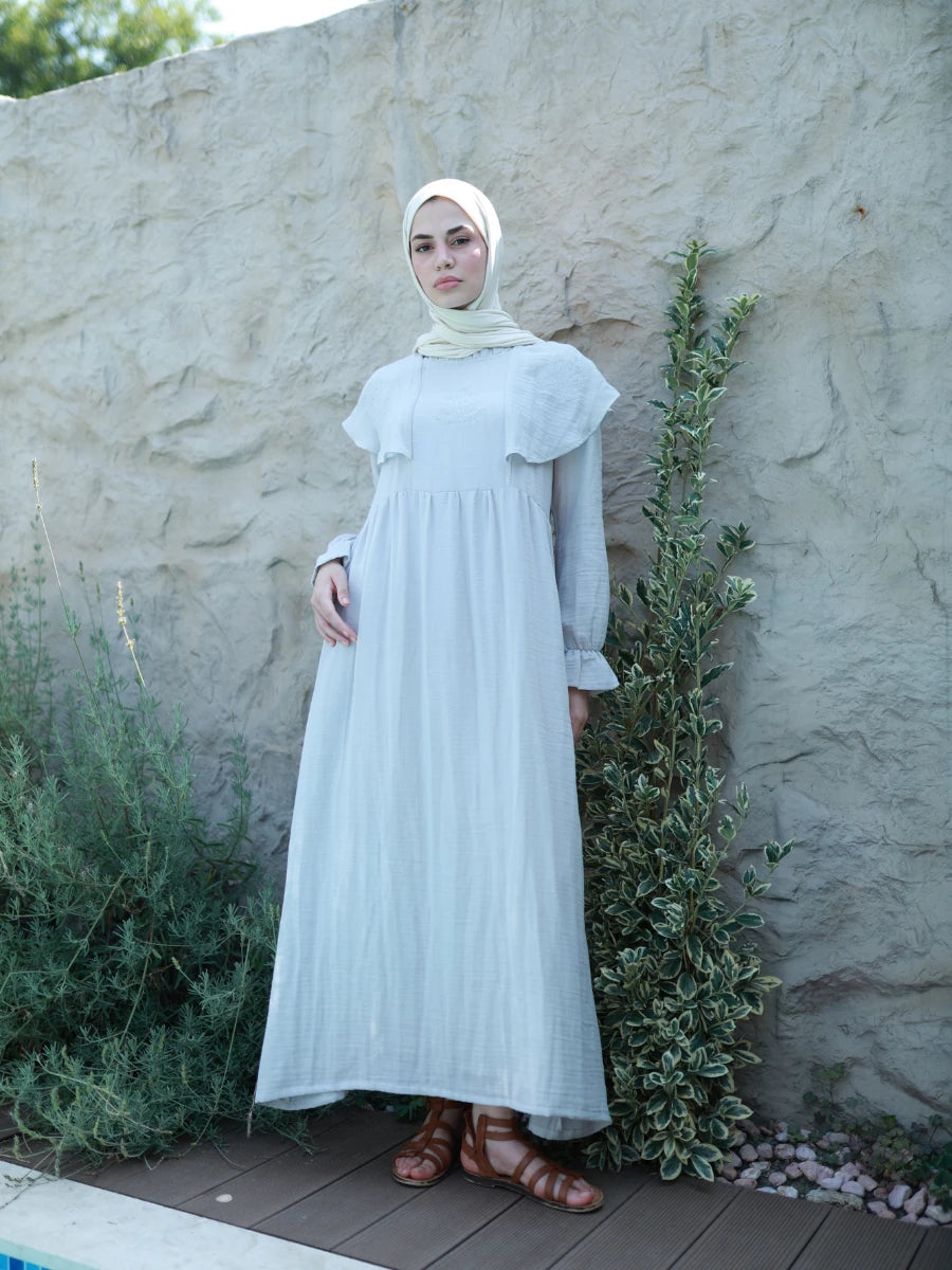 %100 pamuk müslin kumaştan üretilen bu gir renkli elbise, doğal dokusu ve sade şıklığı ile ön plana çıkar. Çift kat dokuma yapısı sayesinde hafif ama tok bir duruşa sahiptir. Geniş ve rahat kesimi, yaz aylarında ferahlık sunarken, gri rengin doğallığıyla her ortamda modern bir görünüm sağlar. Günlük kullanımda, tatilde veya özel anlarda stilinize eşlik eder.