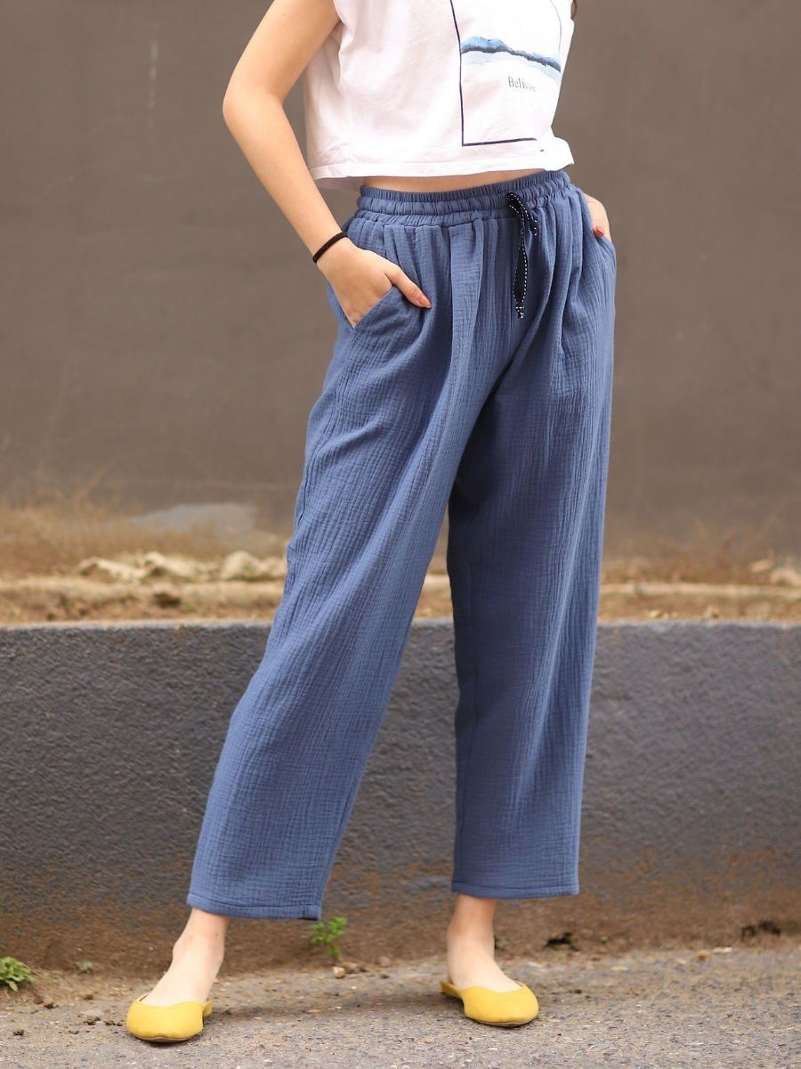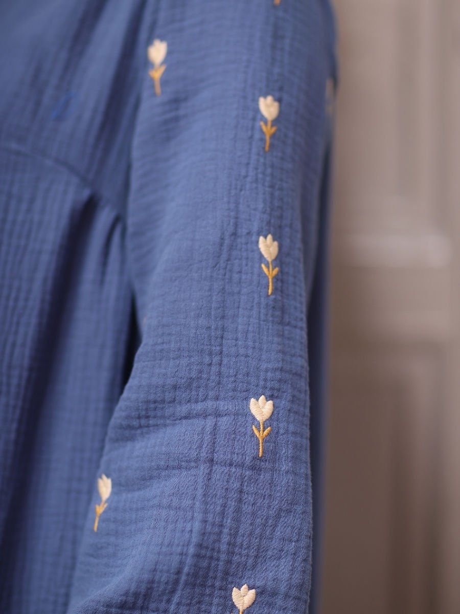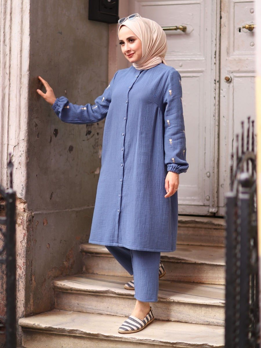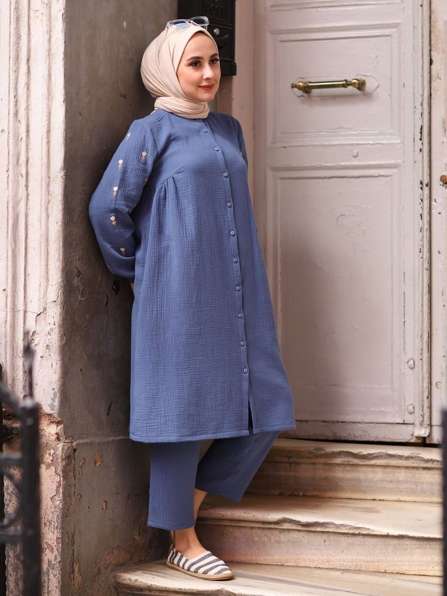 %100 pamuklu müslin kumaştan üretilen bu mavi renkli ikili takım, doğallık ve canlılığı bir arada sunar. Nefes alabilen çift kat dokuması sayesinde ilkbahar ve yaz aylarında maksimum konfor sağlarken, ferahlatıcı mavi tonuyla her ortamda enerjik bir görünüm kazandırır. Takım; tunik ve pantolondan oluşur ve hem konforu hem de zamansız tarzıyla öne çıkar.