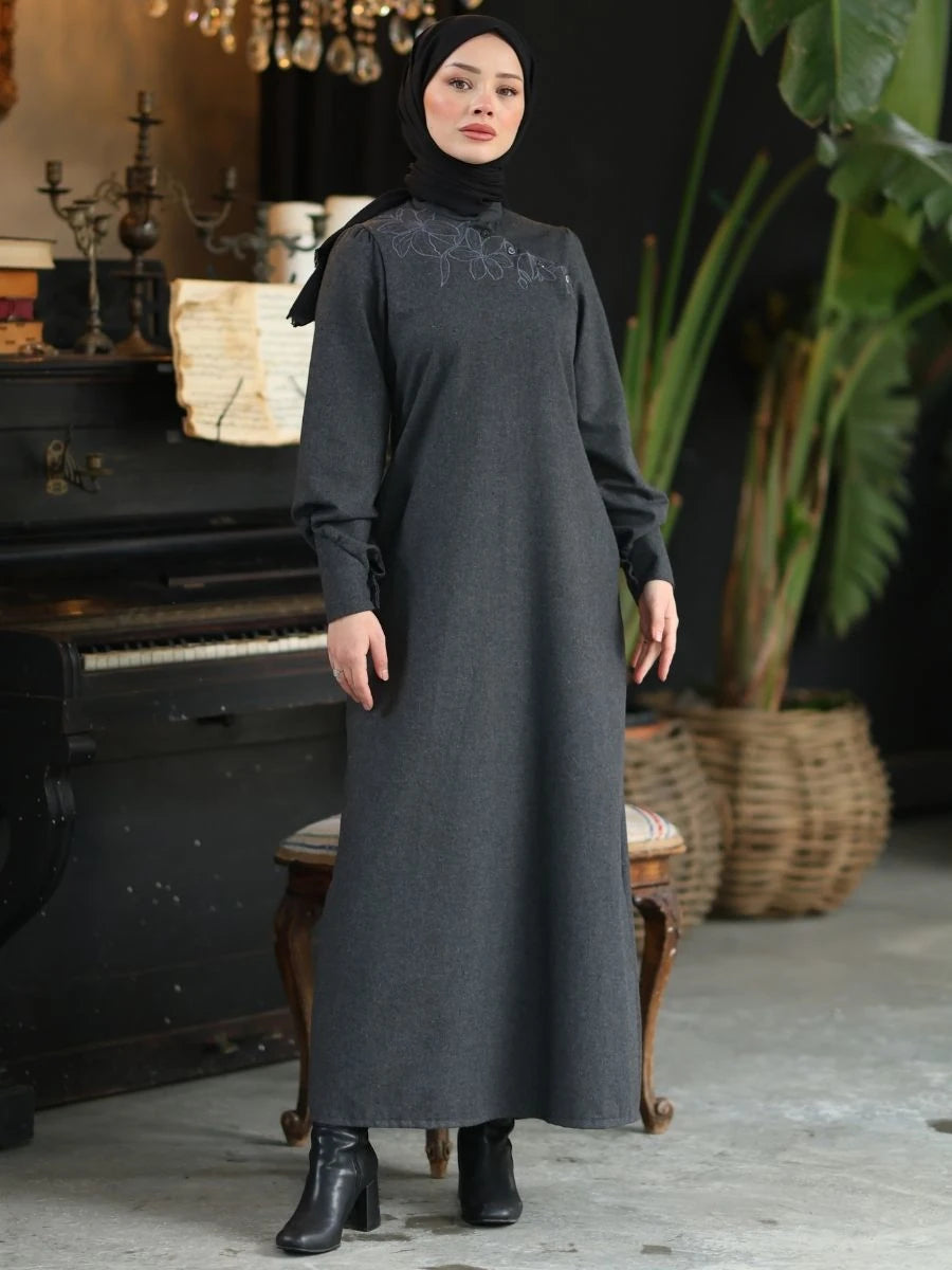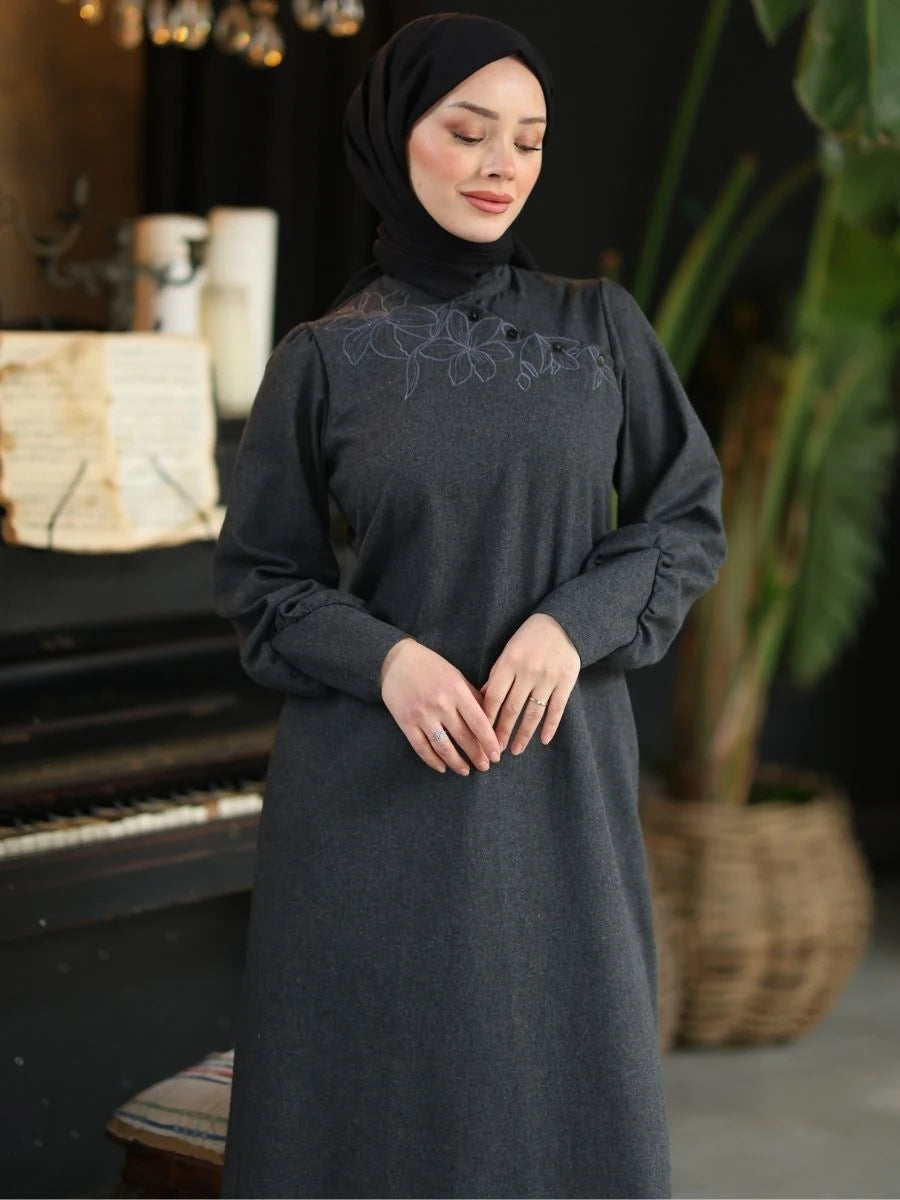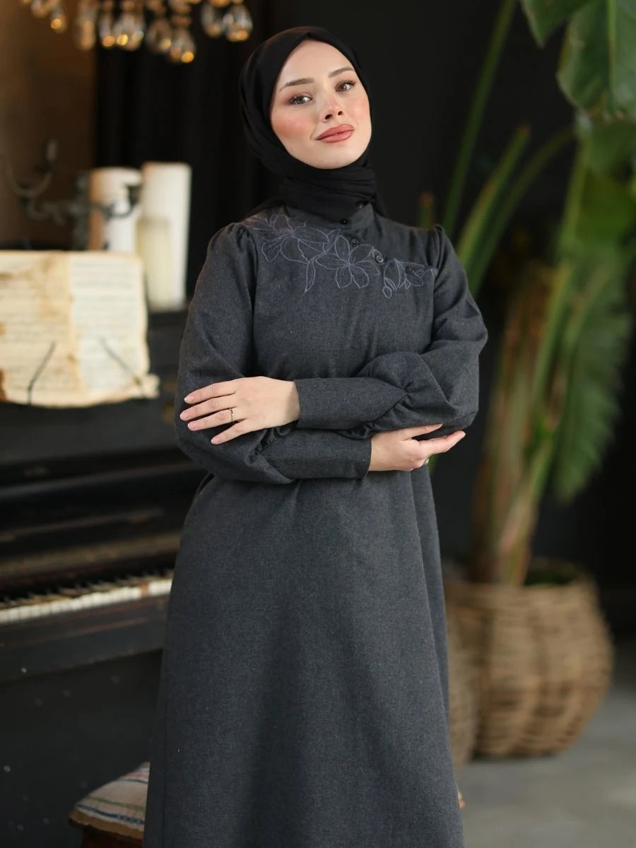 Şehrazat Elbise Koyu Antrasit, pamuklu flanel kumaşın lüks dokusunu koyu antrasit rengin modern ve zarif tonlarıyla birleştiren şık bir elbisedir. Ürün, geniş kesimi ve rahat kalıbı sayesinde hem özel davetlerde hem de günlük kullanımlarda üstün konfor ve estetik sunar. Koyu antrasit, elbisenin sofistike detaylarını ön plana çıkarır.