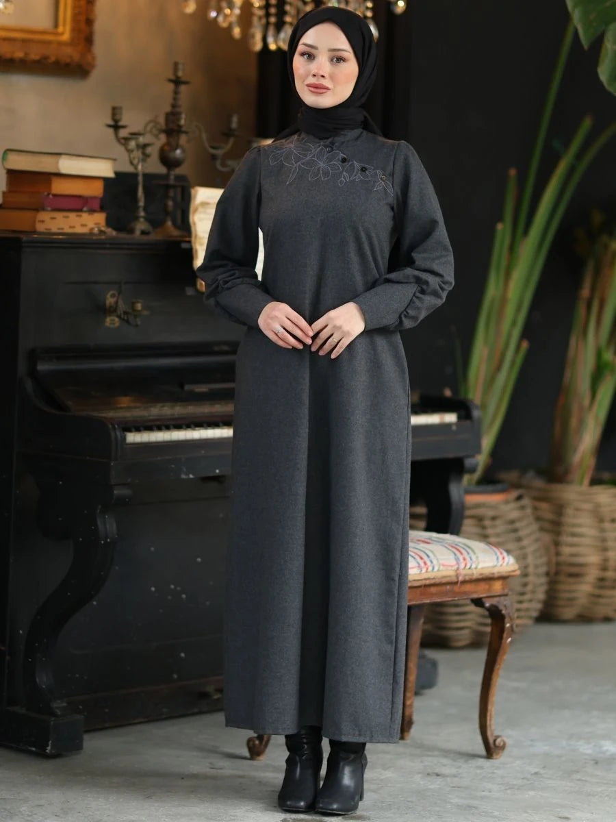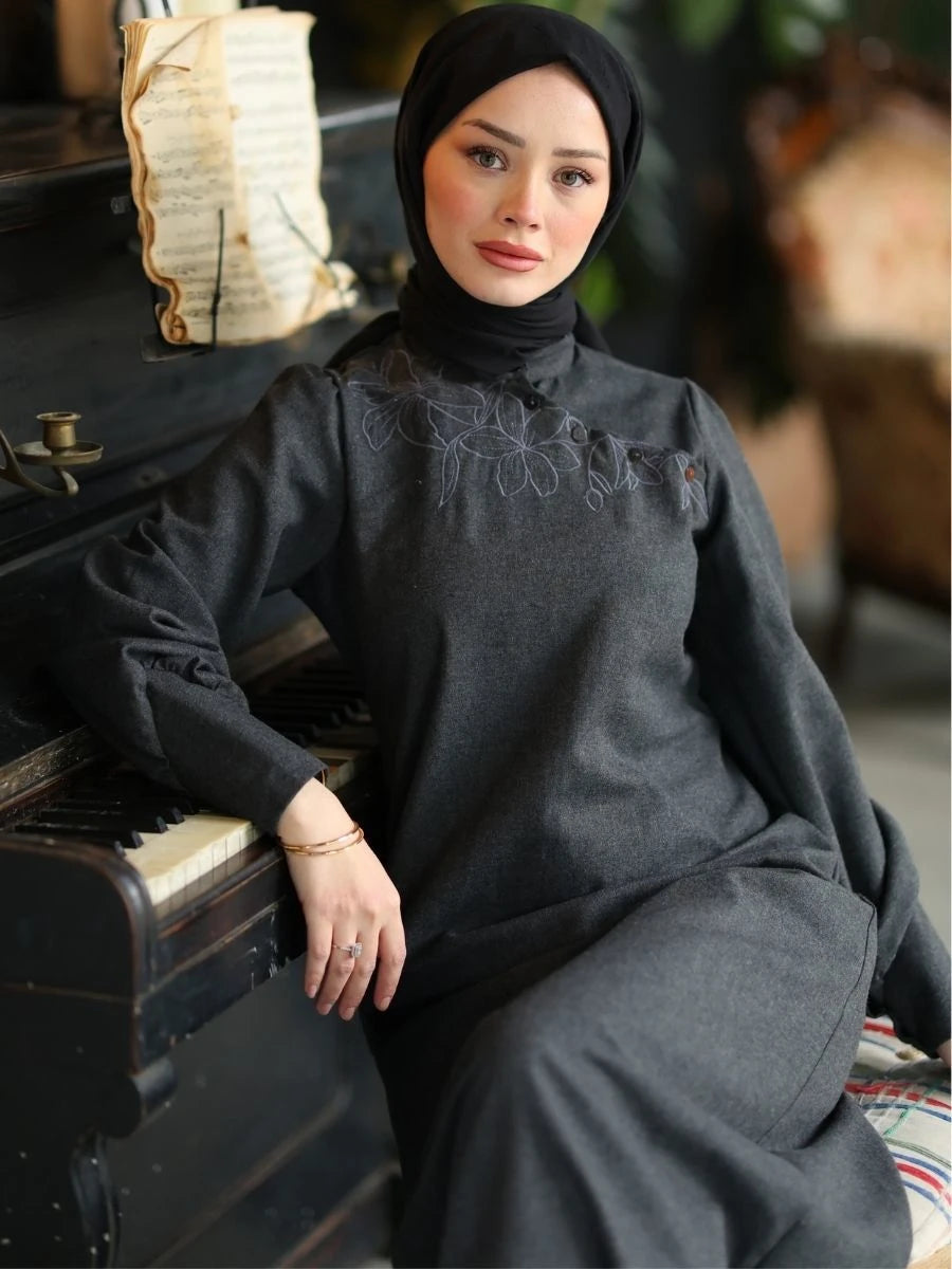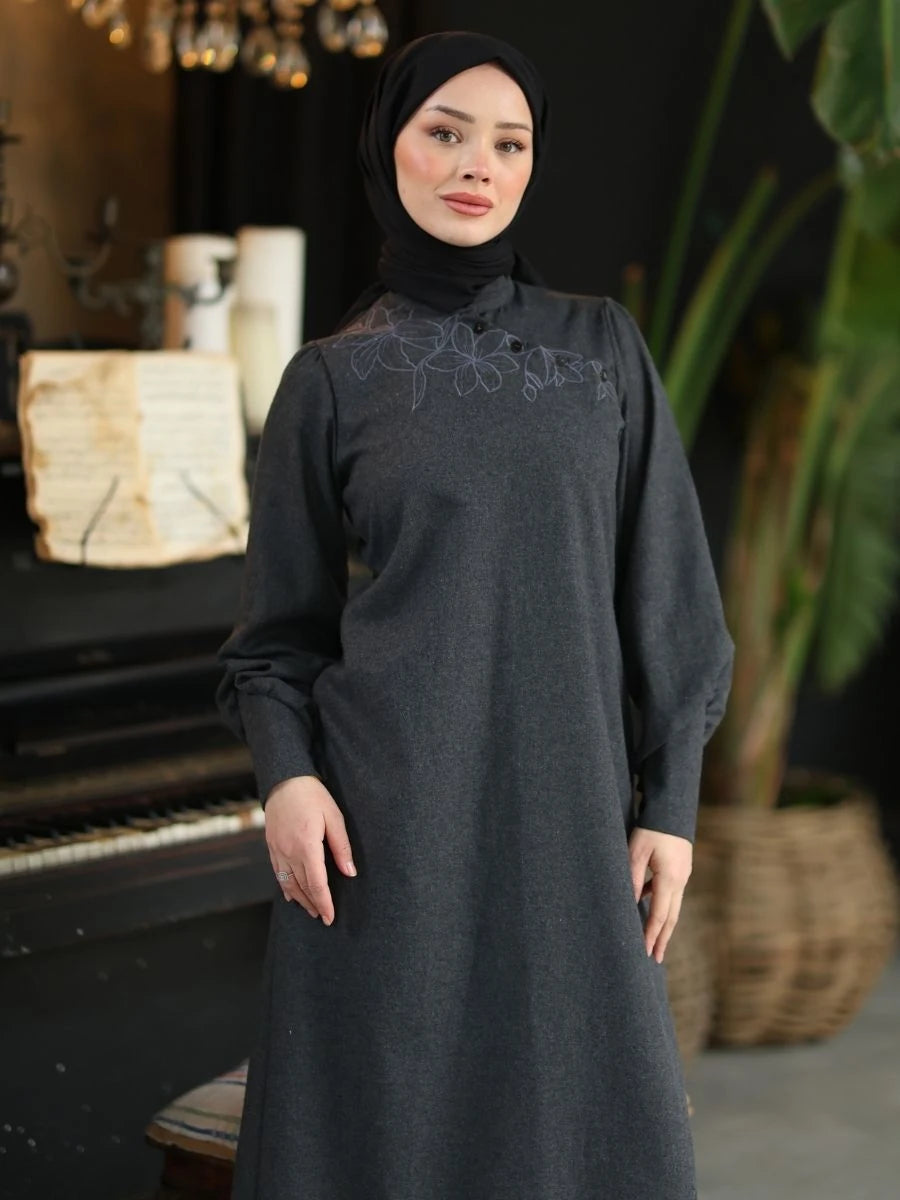 Şehrazat Elbise Koyu Antrasit, pamuklu flanel kumaşın lüks dokusunu koyu antrasit rengin modern ve zarif tonlarıyla birleştiren şık bir elbisedir. Ürün, geniş kesimi ve rahat kalıbı sayesinde hem özel davetlerde hem de günlük kullanımlarda üstün konfor ve estetik sunar. Koyu antrasit, elbisenin sofistike detaylarını ön plana çıkarır.