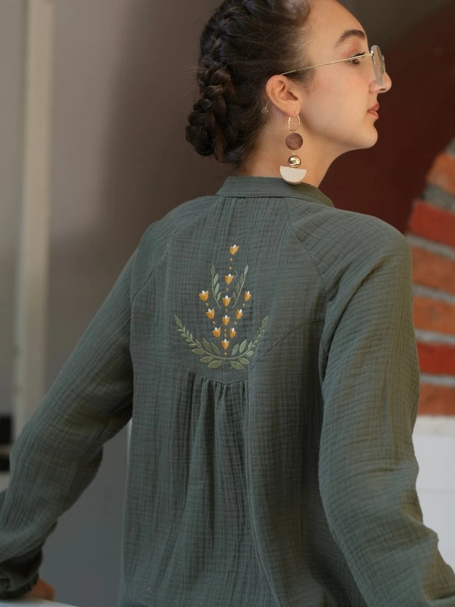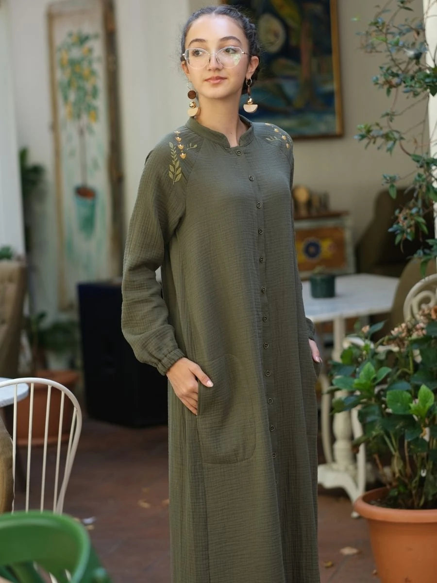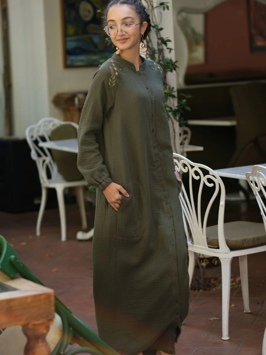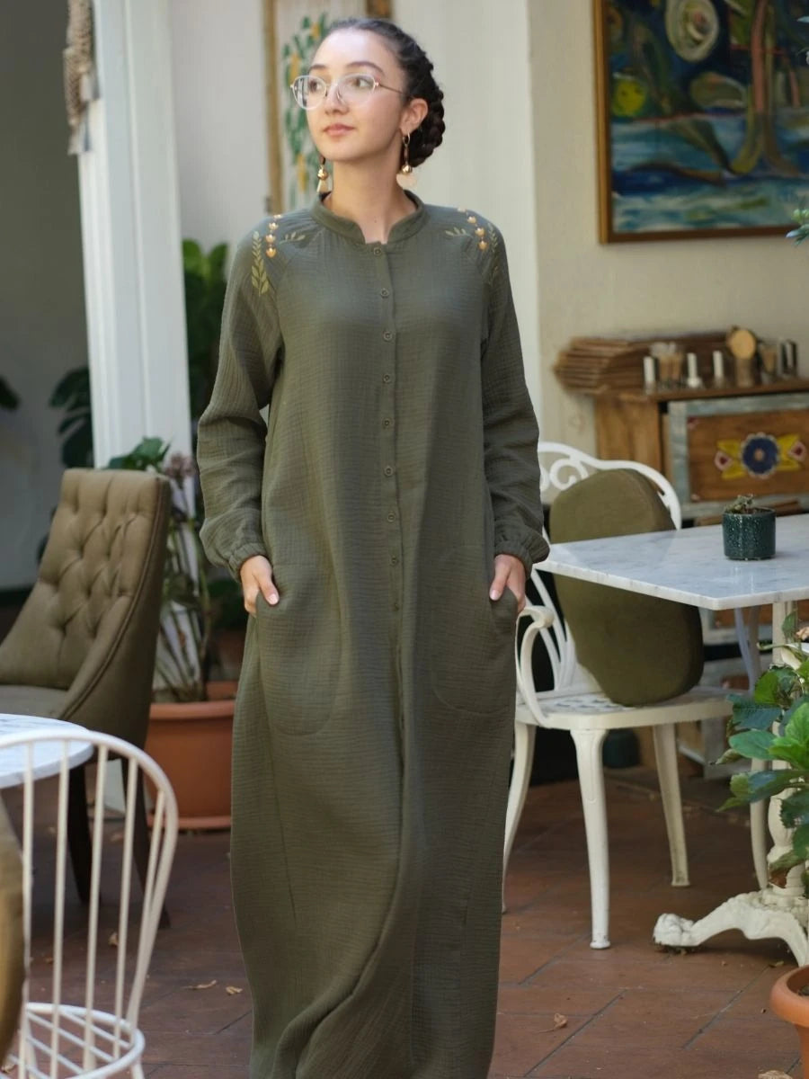 %100 pamuk müslin kumaştan üretilen bu haki renkli elbise, doğal dokusu ve sade şıklığı ile ön plana çıkar. Çift kat dokuma yapısı sayesinde hafif ama tok bir duruşa sahiptir. Geniş ve rahat kesimi, yaz aylarında ferahlık sunarken, haki rengin doğallığıyla her ortamda modern bir görünüm sağlar. Günlük kullanımda, tatilde veya özel anlarda stilinize eşlik eder.