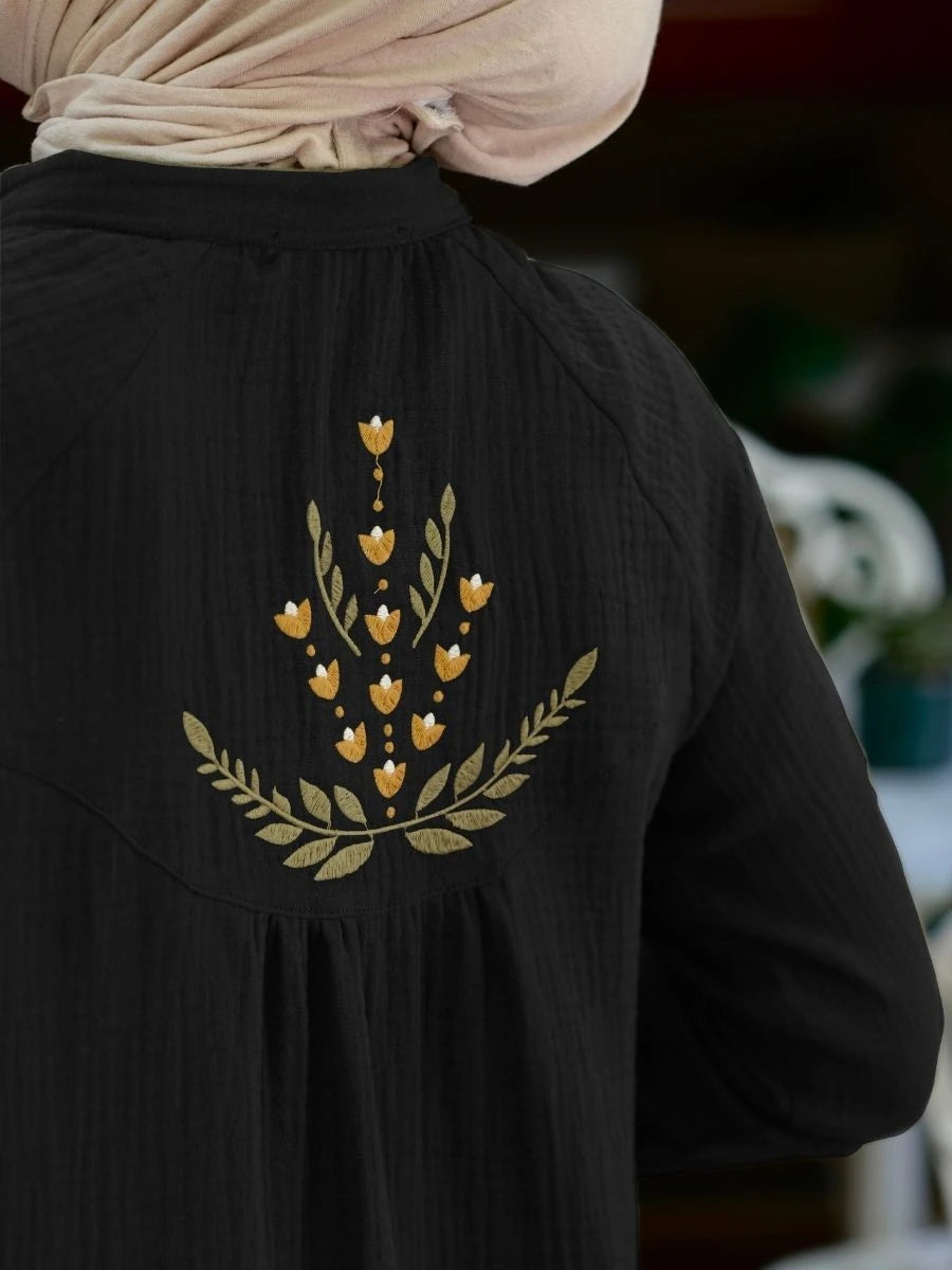 %100 pamuk müslin kumaştan üretilen bu siyah renkli elbise, zamansız şıklık ve modern sadeliği bir araya getirir. Çift kat dokuma yapısı sayesinde nefes alabilir, hafif ve cilt dostu bir yapı sunar. Geniş kesimi ve rahat kalıbı, hem günlük kullanımda hem de özel anlarda konforlu ve zarif bir duruş sağlar. Siyahın güçlü ve klasik etkisi ile her kombine sofistike bir hava katar.